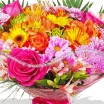 Уменьшенный: хризантема ромашковая фиолетовая - 3 шт., гербера оранжевая - 2 шт., гербера желтая - 1 шт., роза розовая - 2 шт., роза оранжевая - 1 шт., альстромерия оранжевая - 1 шт., альстромерия розовая - 2 шт., хризантема одноголовая зеленая - 1 шт.,лист рабелини - 3 шт, натуральная упаковка розовая, бант в тон.